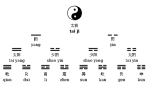 El Yi Jing ( I Ching) está basado en la Cosmología tradicional china. Es una concepción cíclica y dinámica del Cosmos. El proceso comienza con el Uno ( Tao) que se polariza en dos principios antagónicos, el Yin y el Yang, que se manifiesta en términos absolutos como Cielo y Tierra. La Tríada se forma con el tercer elemento del trigrama, el Hombre, es el mediador entre el Cielo y la Tierra. A partir de aquí se elabora el Pakua o los ocho trigramas, que surgen de combinar entre sí las tres líneas que representa el Cielo/ Hombre/ Tierra. Este pakua está simbolizado por ideogramas que representan a la vez formas de la naturaleza y formas del orden social básico ( que es la familia, la institución básica de la sociedad china).